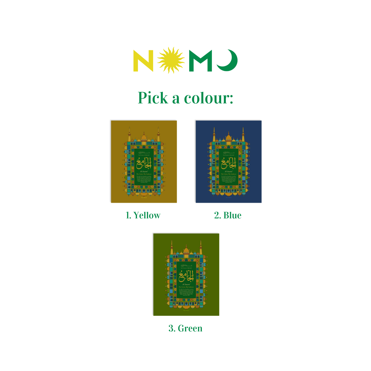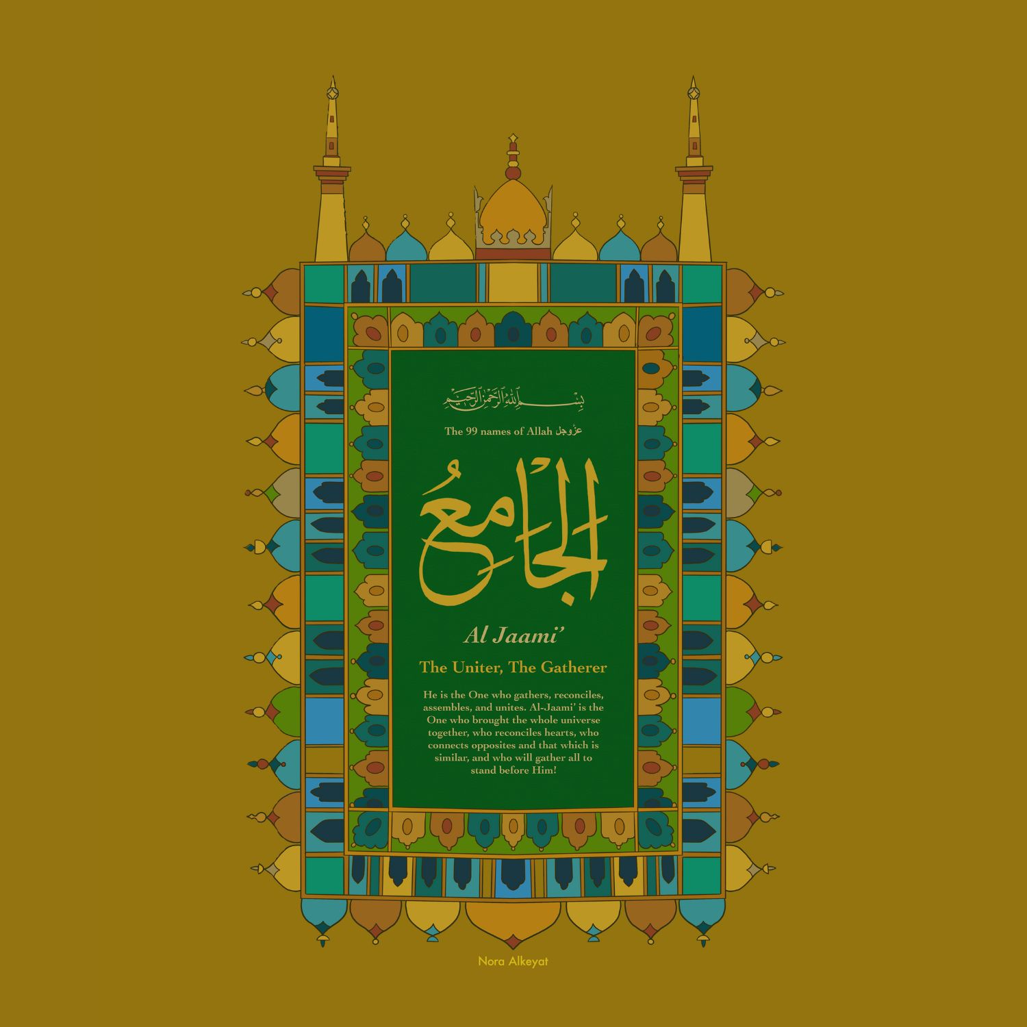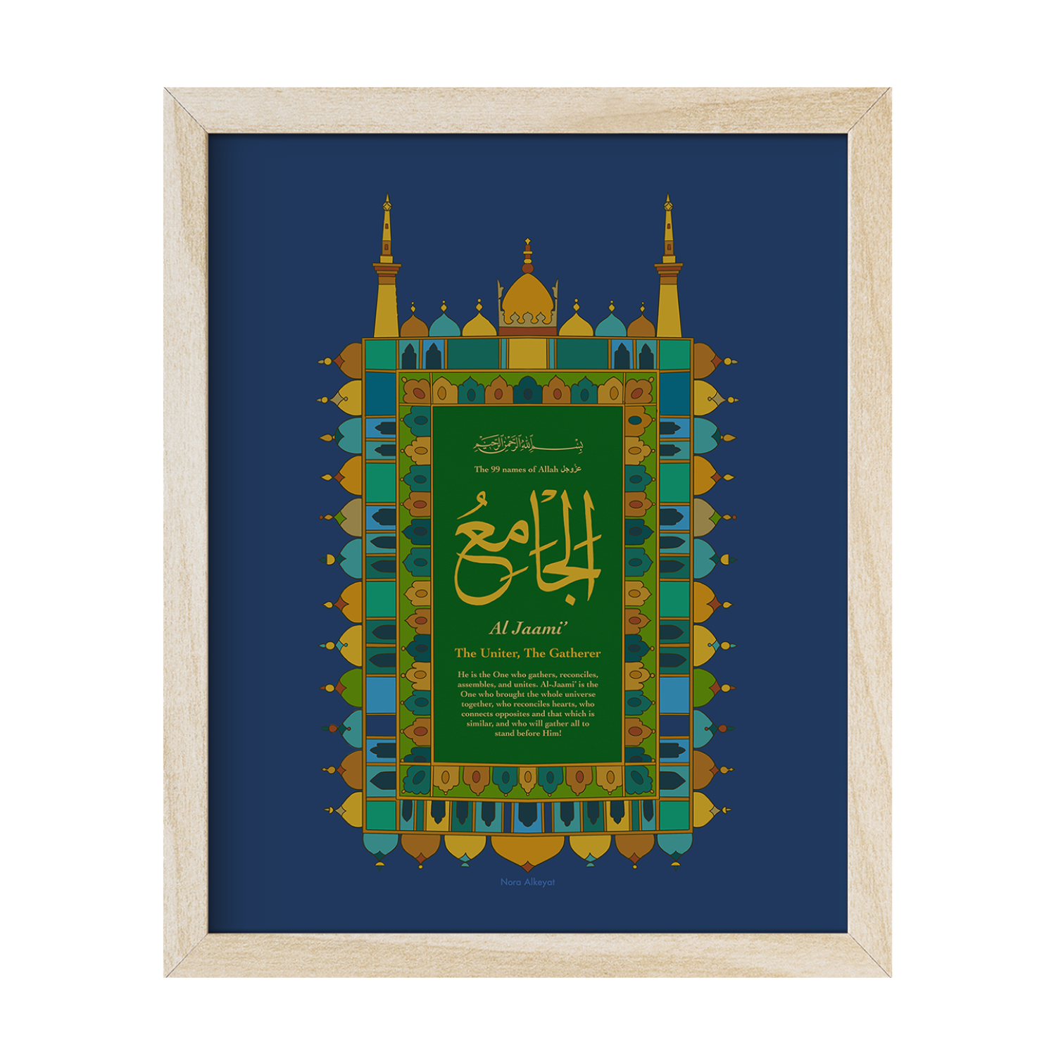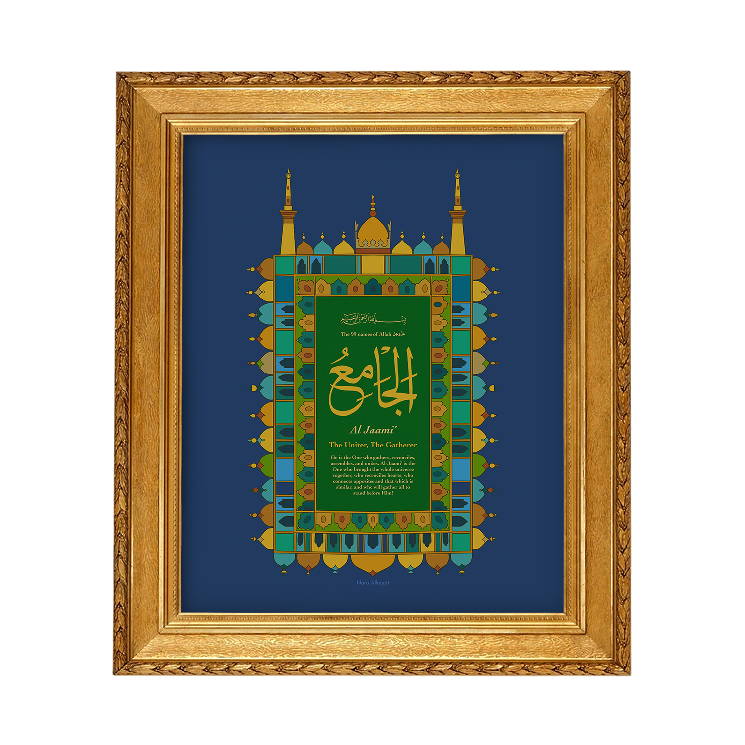 Al-Jaami, one of the most profound Names of Allah, embodies His attribute as The Gatherer — The One who unites, reconciles, and brings together what was once scattered. Displaying this art print in your home will serve as a gentle, powerful reminder of Allah’s ability to draw hearts together, restore unity, and gather all in perfect harmony — whether in community, in faith, or in the hereafter.