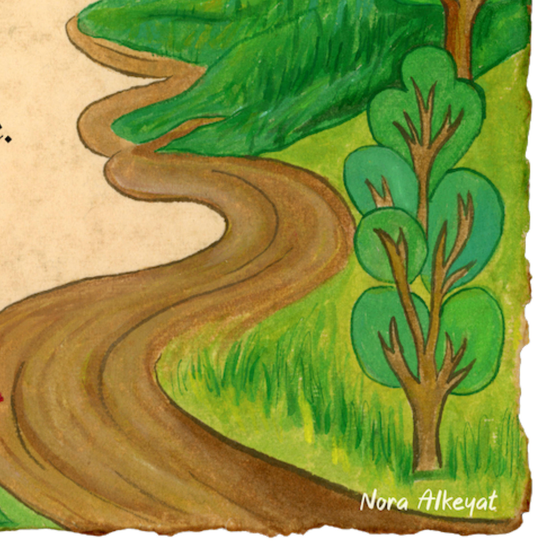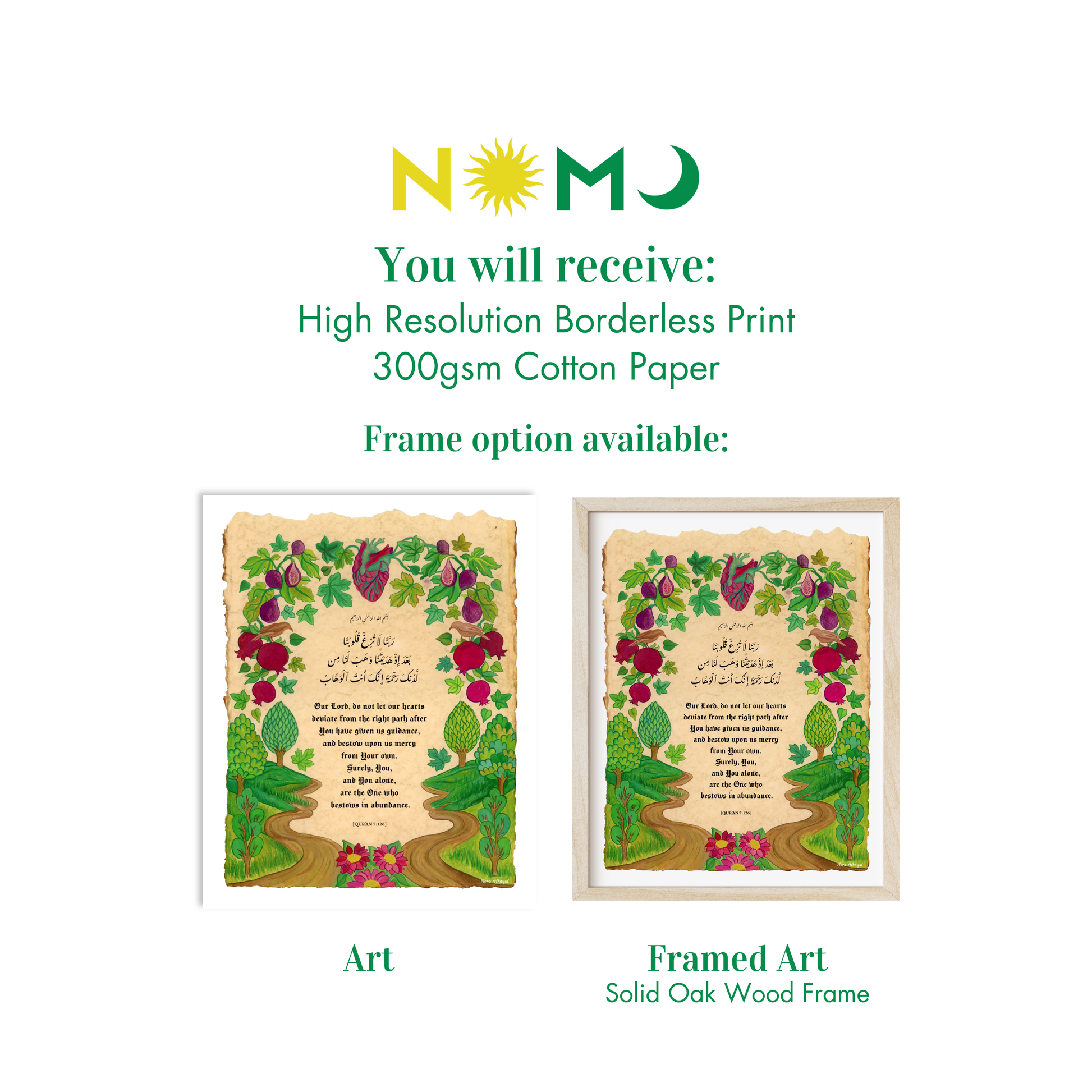 This illustrated prayer draws on the Qur’an to reflect on guidance as a lived and ongoing movement of the soul. The figs and pomegranates signify abundance and blessing, evoking sacred fruits as signs of divine provision and mercy. Surrounding fields, trees, and hills introduce the beauty and difficulty of the journey, suggesting that what appears comforting may also delay one through distraction, while the hills speak to effort, patience, and perseverance. The winding path becomes the central metaphor of seeking guidance from deviation.
