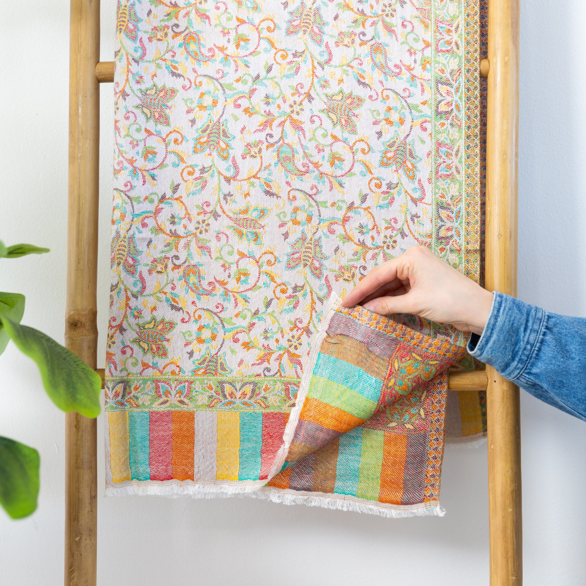 This 100% wool pashmina scarf is perfect for comfort, can serve as a fashion statement piece, or as a gift for your loved one. A one-of-a-kind artisanal craft, each piece & colour is intentionally selected to represent ornamental artistry, motifs from nature, Mughal-Medieval modesty, and Islamic tradition. Designed for warmth and breathability, it is thin & light weight with an exquisite softness to touch.
